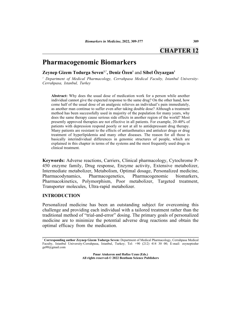 Why does the usual dose of medication work for a person while another individual cannot give the expected response to the same drug? On the other hand, how come half of the usual dose of an analgesic relieves an individual’s pain immediately, as another man continue to suffer even after taking double dose? Although a treatment method has been successfully used in majority of the population for many years, why does the same therapy cause serious side effects in another region of the world? Most presently approved therapies are not effective in all patients. For example, 20-40% of patients with depression respond poorly or not at all to antidepressant drug therapy. Many patients are resistant to the effects of antiasthmatics and antiulcer drugs or drug treatment of hyperlipidemia and many other diseases. The reason for all those is basically interindividual differences in genomic structures of people, which are explained in this chapter in terms of the systems and the most frequently used drugs in clinical treatment.