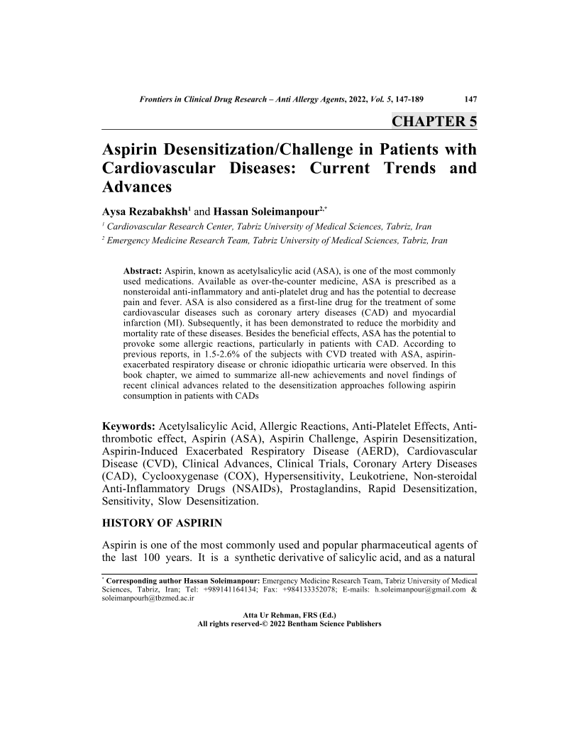 Aspirin, known as acetylsalicylic acid (ASA), is one of the most commonly used medications. Available as over-the-counter medicine, ASA is prescribed as a nonsteroidal anti-inflammatory and anti-platelet drug and has the potential to decrease pain and fever. ASA is also considered as a first-line drug for the treatment of some cardiovascular diseases such as coronary artery diseases (CAD) and myocardial infarction (MI). Subsequently, it has been demonstrated to reduce the morbidity and mortality rate of these diseases. Besides the beneficial effects, ASA has the potential to provoke some allergic reactions, particularly in patients with CAD. According to previous reports, in 1.5-2.6% of the subjects with CVD treated with ASA, aspirinexacerbated respiratory disease or chronic idiopathic urticaria were observed. In this book chapter, we aimed to summarize all-new achievements and novel findings of recent clinical advances related to the desensitization approaches following aspirin consumption in patients with CADs
