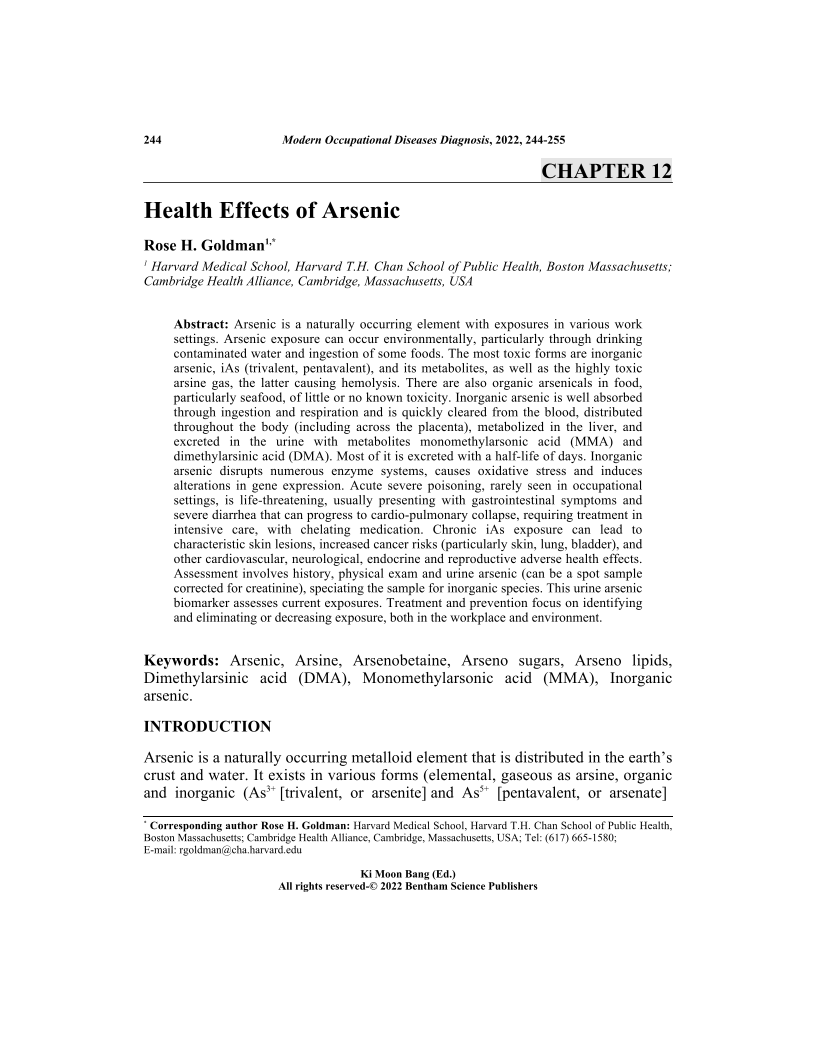 Arsenic is a naturally occurring element with exposures in various work settings. Arsenic exposure can occur environmentally, particularly through drinking contaminated water and ingestion of some foods. The most toxic forms are inorganic arsenic, iAs (trivalent, pentavalent), and its metabolites, as well as the highly toxic arsine gas, the latter causing hemolysis. There are also organic arsenicals in food, particularly seafood, of little or no known toxicity. Inorganic arsenic is well absorbed through ingestion and respiration and is quickly cleared from the blood, distributed throughout the body (including across the placenta), metabolized in the liver, and excreted in the urine with metabolites monomethylarsonic acid (MMA) and dimethylarsinic acid (DMA). Most of it is excreted with a half-life of days. Inorganic arsenic disrupts numerous enzyme systems, causes oxidative stress and induces alterations in gene expression. Acute severe poisoning, rarely seen in occupational settings, is life-threatening, usually presenting with gastrointestinal symptoms and severe diarrhea that can progress to cardio-pulmonary collapse, requiring treatment in intensive care, with chelating medication. Chronic iAs exposure can lead to characteristic skin lesions, increased cancer risks (particularly skin, lung, bladder), and other cardiovascular, neurological, endocrine and reproductive adverse health effects. Assessment involves history, physical exam and urine arsenic (can be a spot sample corrected for creatinine), speciating the sample for inorganic species. This urine arsenic biomarker assesses current exposures. Treatment and prevention focus on identifying and eliminating or decreasing exposure, both in the workplace and environment. nbsp;