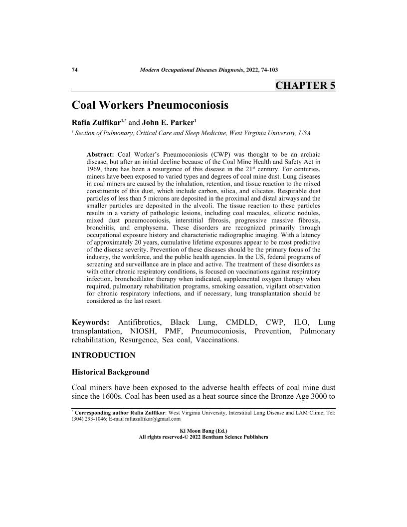 Coal Worker’s Pneumoconiosis (CWP) was thought to be an archaic disease, but after an initial decline because of the Coal Mine Health and Safety Act in 1969, there has been a resurgence of this disease in the 21st century. For centuries, miners have been exposed to varied types and degrees of coal mine dust. Lung diseases in coal miners are caused by the inhalation, retention, and tissue reaction to the mixed constituents of this dust, which include carbon, silica, and silicates. Respirable dust particles of less than 5 microns are deposited in the proximal and distal airways and the smaller particles are deposited in the alveoli. The tissue reaction to these particles results in a variety of pathologic lesions, including coal macules, silicotic nodules, mixed dust pneumoconiosis, interstitial fibrosis, progressive massive fibrosis, bronchitis, and emphysema. These disorders are recognized primarily through occupational exposure history and characteristic radiographic imaging. With a latency of approximately 20 years, cumulative lifetime exposures appear to be most predictive of the disease severity. Prevention of these diseases should be the primary focus of the industry, the workforce, and the public health agencies. In the US, federal programs of screening and surveillance are in place and active. The treatment of these disorders as with other chronic respiratory conditions, is focused on vaccinations against respiratory infection, bronchodilator therapy when indicated, supplemental oxygen therapy when required, pulmonary rehabilitation programs, smoking cessation, vigilant observation for chronic respiratory infections, and if necessary, lung transplantation should be considered as the last resort.