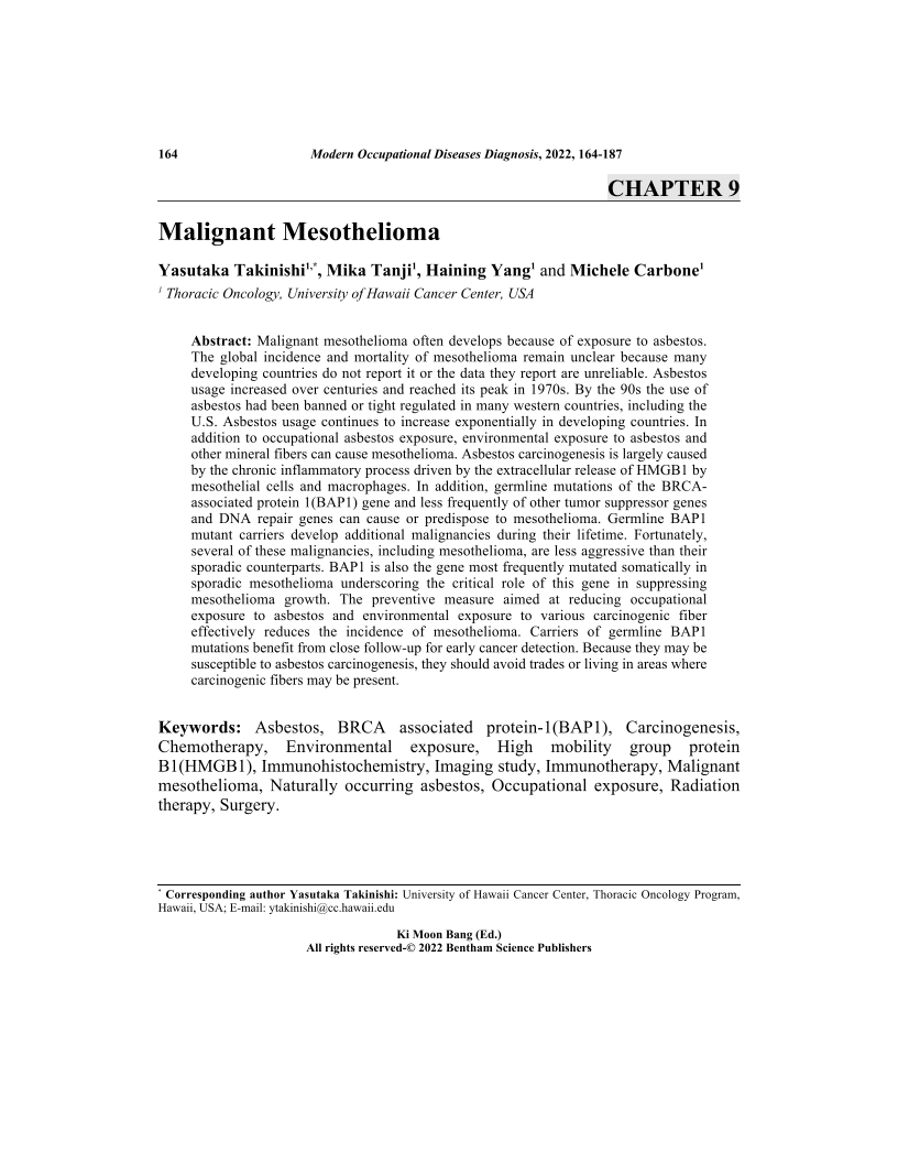 Malignant mesothelioma often develops because of exposure to asbestos. The global incidence and mortality of mesothelioma remain unclear because many developing countries do not report it or the data they report are unreliable. Asbestos usage increased over centuries and reached its peak in 1970s. By the 90s the use of asbestos had been banned or tight regulated in many western countries, including the U.S. Asbestos usage continues to increase exponentially in developing countries. In addition to occupational asbestos exposure, environmental exposure to asbestos and other mineral fibers can cause mesothelioma. Asbestos carcinogenesis is largely caused by the chronic inflammatory process driven by the extracellular release of HMGB1 by mesothelial cells and macrophages. In addition, germline mutations of the BRCAassociated protein 1(BAP1) gene and less frequently of other tumor suppressor genes and DNA repair genes can cause or predispose to mesothelioma. Germline BAP1 mutant carriers develop additional malignancies during their lifetime. Fortunately, several of these malignancies, including mesothelioma, are less aggressive than their sporadic counterparts. BAP1 is also the gene most frequently mutated somatically in sporadic mesothelioma underscoring the critical role of this gene in suppressing mesothelioma growth. The preventive measure aimed at reducing occupational exposure to asbestos and environmental exposure to various carcinogenic fiber effectively reduces the incidence of mesothelioma. Carriers of germline BAP1 mutations benefit from close follow-up for early cancer detection. Because they may be susceptible to asbestos carcinogenesis, they should avoid trades or living in areas where carcinogenic fibers may be present.