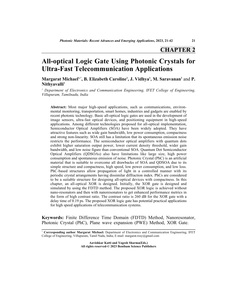 All-optical Logic Gate Using Photonic Crystals for Ultra-Fast Telecommunication Applications, Page 1 of 1
