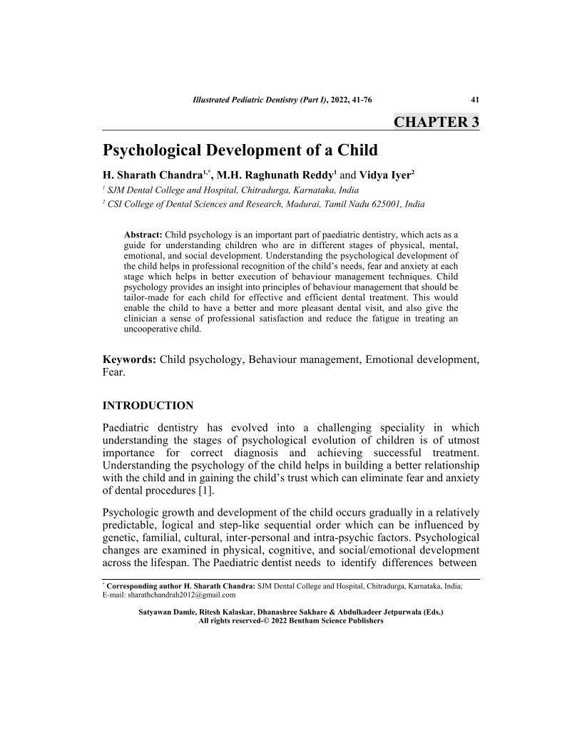 Child psychology is an important part of paediatric dentistry, which acts as a guide for understanding children who are in different stages of physical, mental, emotional, and social development. Understanding the psychological development of the child helps in professional recognition of the child's needs, fear and anxiety at each stage which helps in better execution of behaviour management techniques. Child psychology provides an insight into principles of behaviour management that should be tailor-made for each child for effective and efficient dental treatment. This would enable the child to have a better and more pleasant dental visit, and also give the clinician a sense of professional satisfaction and reduce the fatigue in treating an uncooperative child.