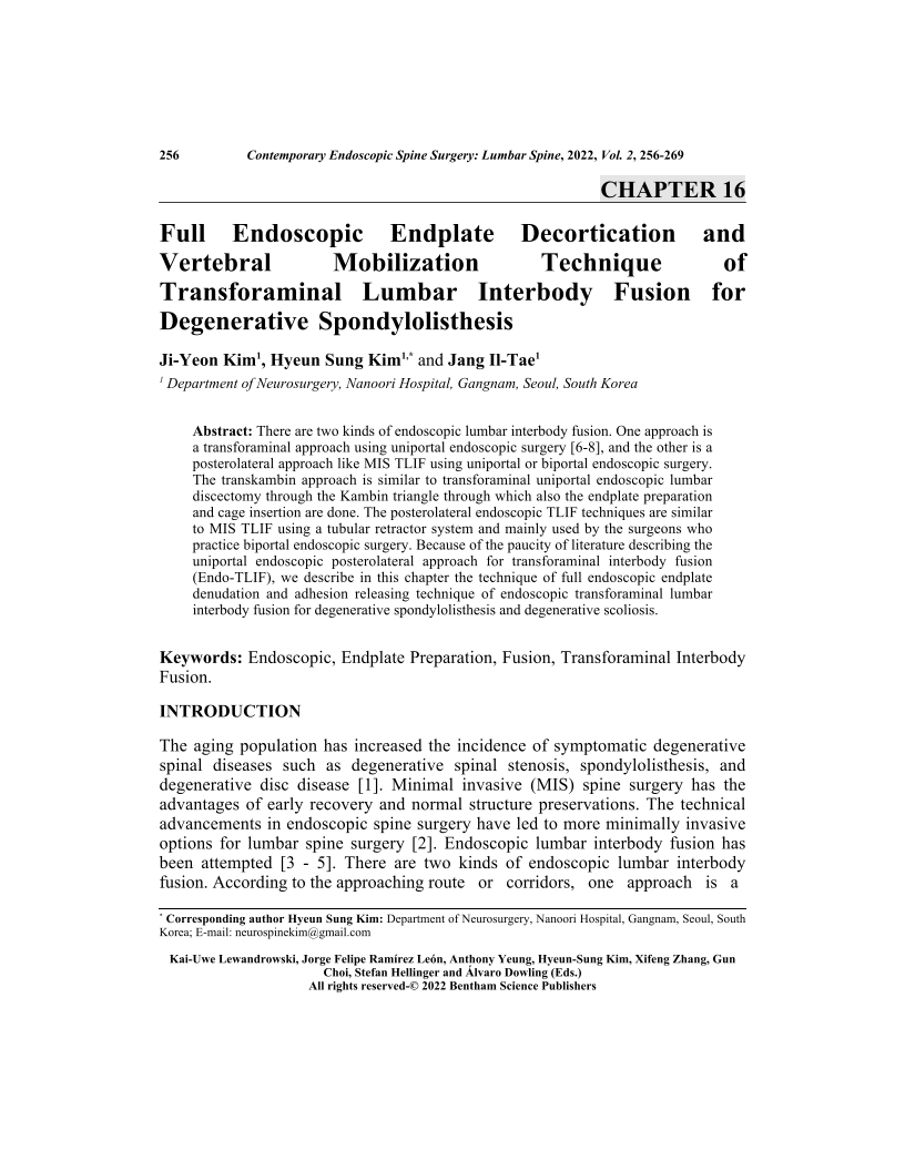 There are two kinds of endoscopic lumbar interbody fusion. One approach isa transforaminal approach using uniportal endoscopic surgery [6-8], and the other is aposterolateral approach like MIS TLIF using uniportal or biportal endoscopic surgery.The transkambin approach is similar to transforaminal uniportal endoscopic lumbardiscectomy through the Kambin triangle through which also the endplate preparationand cage insertion are done. The posterolateral endoscopic TLIF techniques are similarto MIS TLIF using a tubular retractor system and mainly used by the surgeons whopractice biportal endoscopic surgery. Because of the paucity of literature describing theuniportal endoscopic posterolateral approach for transforaminal interbody fusion(Endo-TLIF), we describe in this chapter the technique of full endoscopic endplatedenudation and adhesion releasing technique of endoscopic transforaminal lumbarinterbody fusion for degenerative spondylolisthesis and degenerative scoliosis.