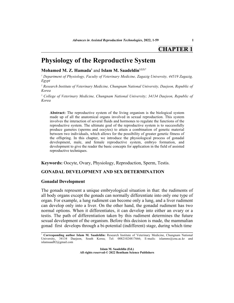 The reproductive system of the living organism is the biological system made up of all the anatomical organs involved in sexual reproduction. This system involves the interaction of several fluids and hormones to regulate the functions of the reproductive system. The ultimate goal of the reproductive system is to successfully produce gametes (sperms and oocytes) to attain a combination of genetic material between two individuals, which allows for the possibility of greater genetic fitness of the offspring. In this chapter, we introduce the physiological process of gonadal development, male, and female reproductive system, embryo formation, and development to give the reader the basic concepts for application in the field of assisted reproductive techniques.
