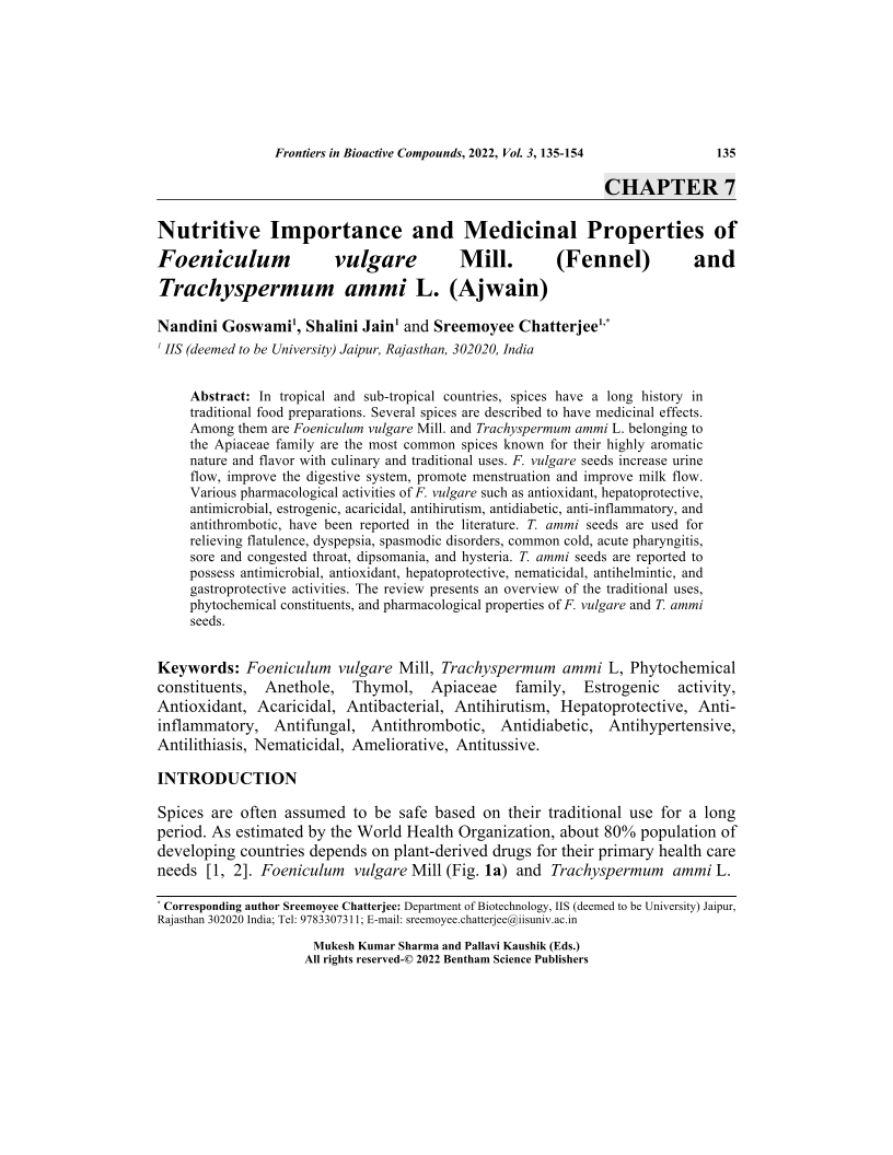 Nutritive Importance and Medicinal Properties of Foeniculum vulgare Mill. (Fennel) and Trachyspermum ammi L. (Ajwain), Page 1 of 1