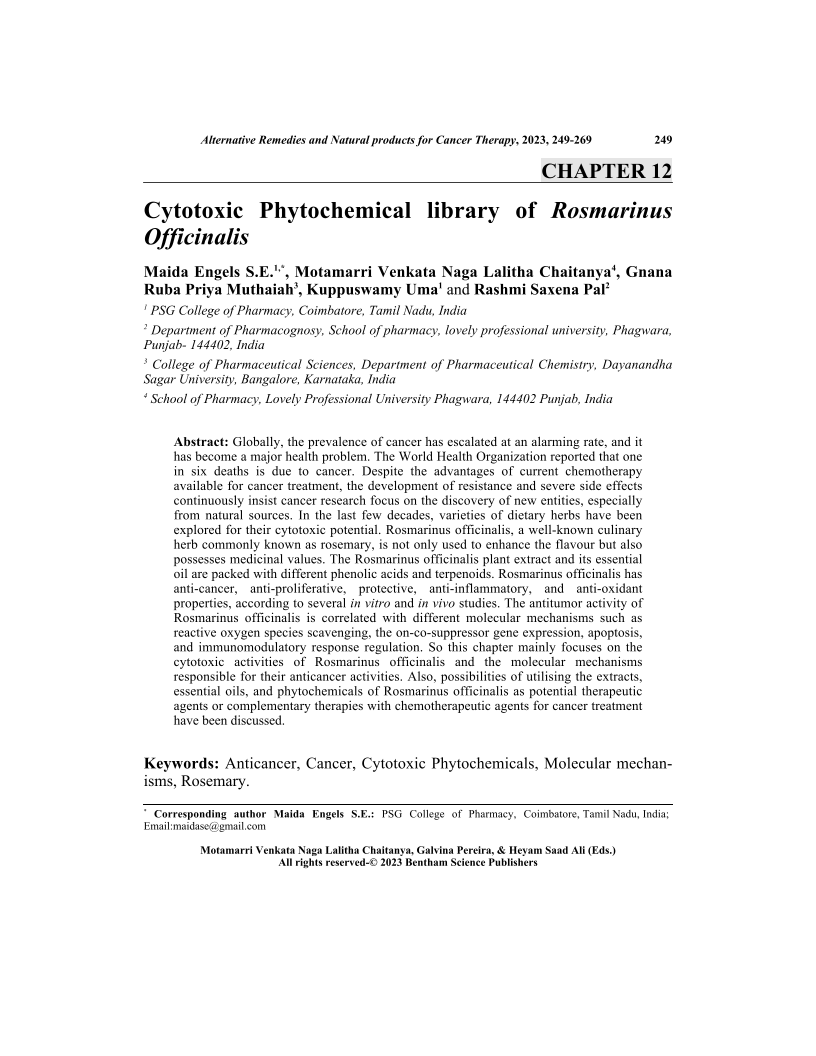 Globally, the prevalence of cancer has escalated at an alarming rate, and it has become a major health problem. The World Health Organization reported that one in six deaths is due to cancer. Despite the advantages of current chemotherapy available for cancer treatment, the development of resistance and severe side effects continuously insist cancer research focus on the discovery of new entities, especially from natural sources. In the last few decades, varieties of dietary herbs have been explored for their cytotoxic potential. Rosmarinus officinalis, a well-known culinary herb commonly known as rosemary, is not only used to enhance the flavour but also possesses medicinal values. The Rosmarinus officinalis plant extract and its essential oil are packed with different phenolic acids and terpenoids. Rosmarinus officinalis has anti-cancer, anti-proliferative, protective, anti-inflammatory, and anti-oxidant properties, according to several in vitro and in vivo studies. The antitumor activity of Rosmarinus officinalis is correlated with different molecular mechanisms such as reactive oxygen species scavenging, the on-co-suppressor gene expression, apoptosis, and immunomodulatory response regulation. So this chapter mainly focuses on the cytotoxic activities of Rosmarinus officinalis and the molecular mechanisms responsible for their anticancer activities. Also, possibilities of utilising the extracts, essential oils, and phytochemicals of Rosmarinus officinalis as potential therapeutic agents or complementary therapies with chemotherapeutic agents for cancer treatment have been discussed. <br>