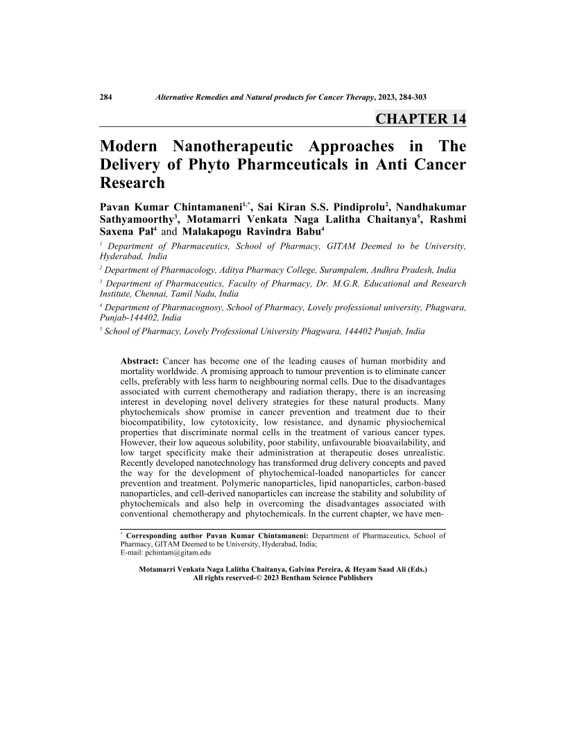 Modern Nanotherapeutic Approaches in The Delivery of Phyto Pharmceuticals in Anti Cancer Research, Page 1 of 1