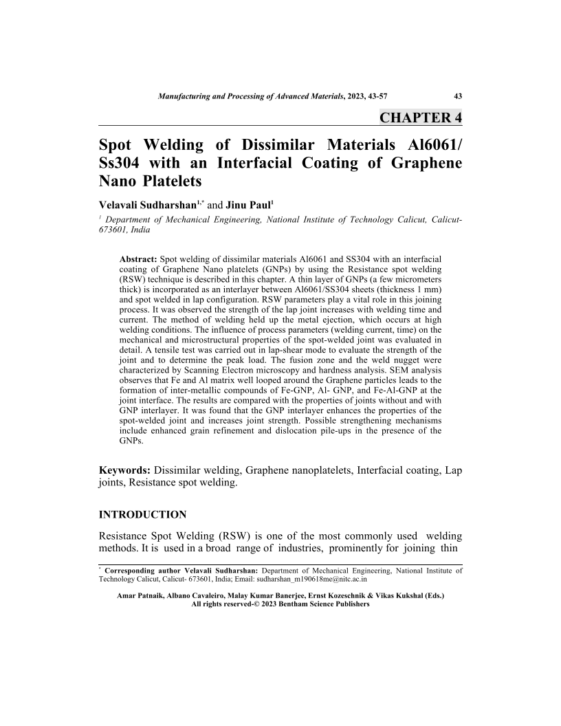 Spot Welding of Dissimilar Materials Al6061/ Ss304 with an Interfacial Coating of Graphene Nano Platelets, Page 1 of 1