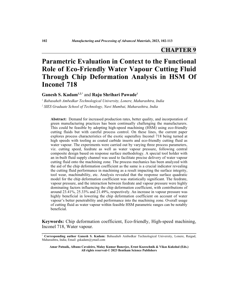 Parametric Evaluation in Context to the Functional Role of Eco-Friendly Water Vapour Cutting Fluid Through Chip Deformation Analysis in HSM Of Inconel 718, Page 1 of 1