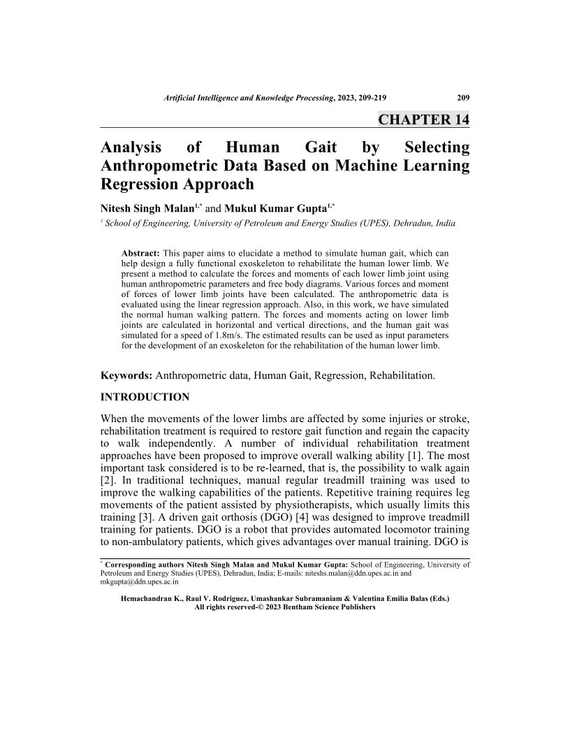 Analysis of Human Gait by Selecting Anthropometric Data Based on Machine Learning Regression Approach, Page 1 of 1