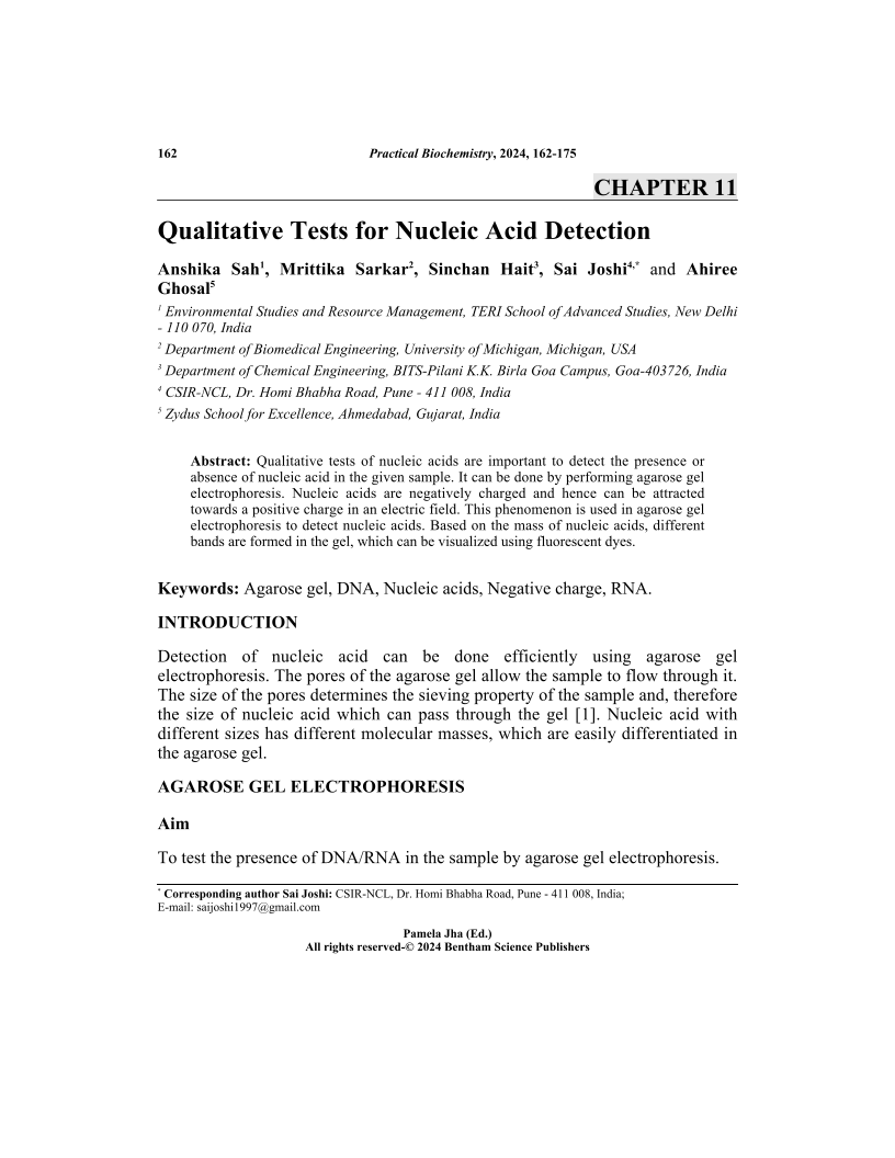 Qualitative tests of nucleic acids are important to detect the presence or absence of nucleic acid in the given sample. It can be done by performing agarose gel electrophoresis. Nucleic acids are negatively charged and hence can be attracted towards a positive charge in an electric field. This phenomenon is used in agarose gel electrophoresis to detect nucleic acids. Based on the mass of nucleic acids, different bands are formed in the gel, which can be visualized using fluorescent dyes.