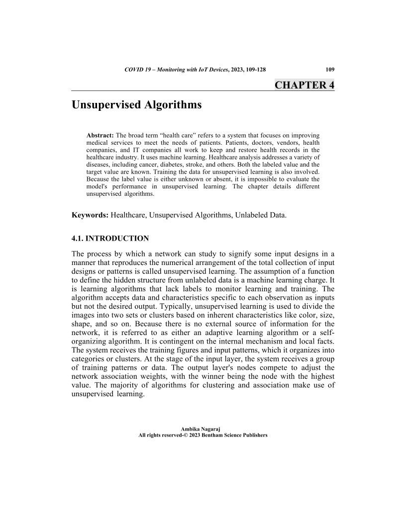 The broad term “health care” refers to a system that focuses on improving medical services to meet the needs of patients. Patients, doctors, vendors, health companies, and IT companies all work to keep and restore health records in the healthcare industry. It uses machine learning. Healthcare analysis addresses a variety of diseases, including cancer, diabetes, stroke, and others. Both the labeled value and the target value are known. Training the data for unsupervised learning is also involved. Because the label value is either unknown or absent, it is impossible to evaluate the model's performance in unsupervised learning. The chapter details different unsupervised algorithms. nbsp;