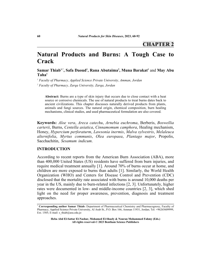 Burns are a type of skin injury that occurs due to close contact with a heat source or corrosive chemicals. The use of natural products to treat burns dates back to ancient civilizations. This chapter discusses naturally derived products from plants, animals and fungi sources. The natural origin, chemical composition, burn healing mechanisms, clinical studies, and used pharmaceutical formulation are also covered. nbsp;