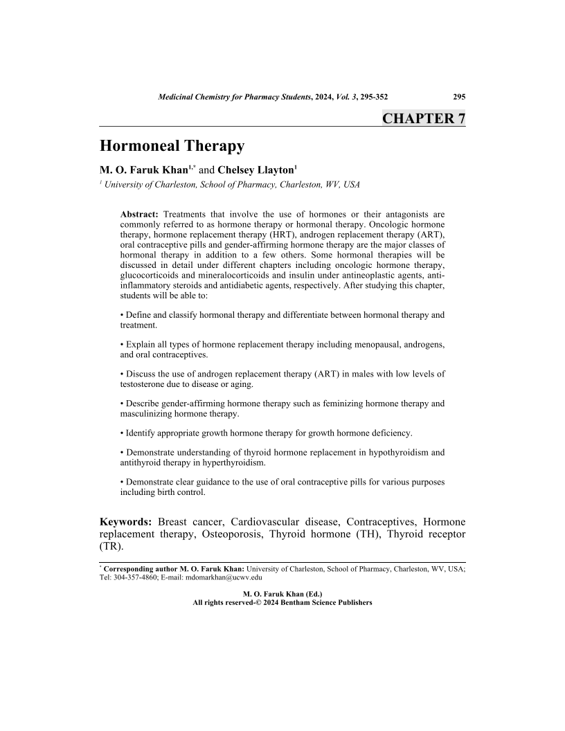Treatments that involve the use of hormones or their antagonists are commonly referred to as hormone therapy or hormonal therapy. Oncologic hormone therapy, hormone replacement therapy (HRT), androgen replacement therapy (ART), oral contraceptive pills and gender-affirming hormone therapy are the major classes of hormonal therapy in addition to a few others. Some hormonal therapies will be discussed in detail under different chapters including oncologic hormone therapy, glucocorticoids and mineralocorticoids and insulin under antineoplastic agents, antiinflammatory steroids and antidiabetic agents, respectively. After studying this chapter, students will be able to: Define and classify hormonal therapy and differentiate between hormonal therapy and treatment. Explain all types of hormone replacement therapy including menopausal, androgens, and oral contraceptives. Discuss the use of androgen replacement therapy (ART) in males with low levels of testosterone due to disease or aging. Describe gender-affirming hormone therapy such as feminizing hormone therapy and masculinizing hormone therapy. Identify appropriate growth hormone therapy for growth hormone deficiency. Demonstrate understanding of thyroid hormone replacement in hypothyroidism and antithyroid therapy in hyperthyroidism. Demonstrate clear guidance to the use of oral contraceptive pills for various purposes including birth control.