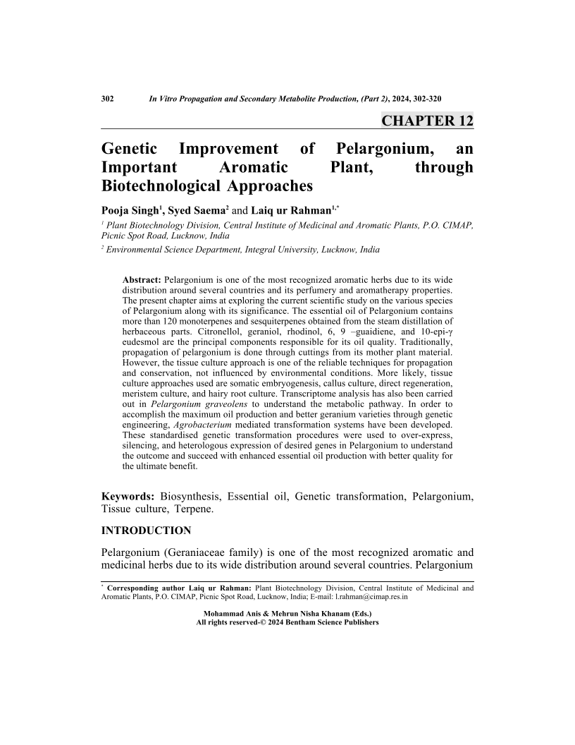 Genetic Improvement of Pelargonium, an Important Aromatic Plant, through Biotechnological Approaches, Page 1 of 1