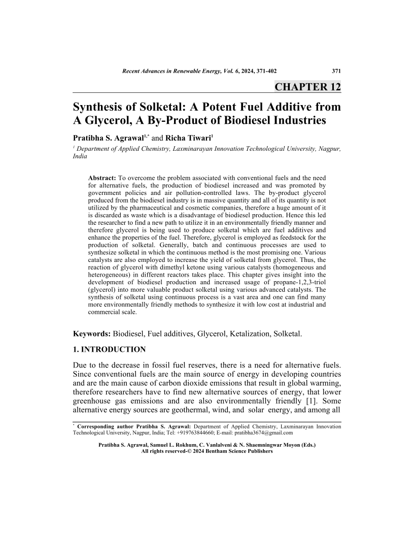 Synthesis of Solketal: A Potent Fuel Additive from A Glycerol, A By-Product of Biodiesel Industries, Page 1 of 1