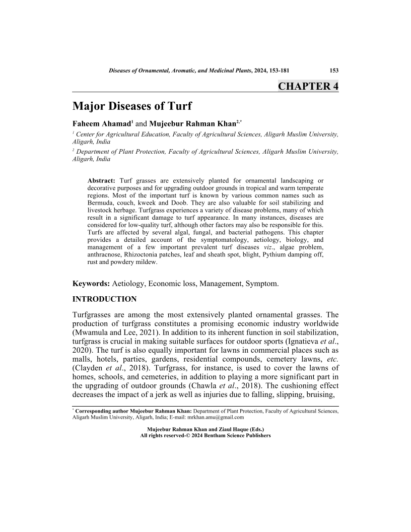 Turf grasses are extensively planted for ornamental landscaping or decorative purposes and for upgrading outdoor grounds in tropical and warm temperate regions. Most of the important turf is known by various common names such as Bermuda, couch, kweek and Doob. They are also valuable for soil stabilizing and livestock herbage. Turfgrass experiences a variety of disease problems, many of which result in a significant damage to turf appearance. In many instances, diseases are considered for low-quality turf, although other factors may also be responsible for this. Turfs are affected by several algal, fungal, and bacterial pathogens. This chapter provides a detailed account of the symptomatology, aetiology, biology, and management of a few important prevalent turf diseases viz., algae problem, anthracnose, Rhizoctonia patches, leaf and sheath spot, blight, Pythium damping off, rust and powdery mildew.