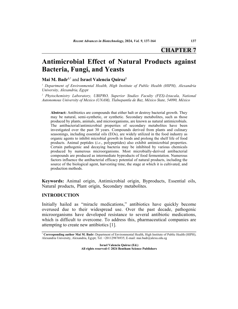 Antibiotics are compounds that either halt or destroy bacterial growth. They may be natural, semi-synthetic, or synthetic. Secondary metabolites, such as those produced by plants, animals, and microorganisms, are known as natural antimicrobials. The antibacterial/antimicrobial properties of secondary metabolites have been investigated over the past 30 years. Compounds derived from plants and culinary seasonings, including essential oils (EOs), are widely utilized in the food industry as organic agents to inhibit microbial growth in foods and prolong the shelf life of food products. Animal peptides (i.e., polypeptides) also exhibit antimicrobial properties. Certain pathogenic and decaying bacteria may be inhibited by various chemicals produced by numerous microorganisms. Most microbially-derived antibacterial compounds are produced as intermediate byproducts of food fermentation. Numerous factors influence the antibacterial efficacy potential of natural products, including the source of the biological agent, harvesting time, the stage at which it is cultivated, and production methods.<br>
