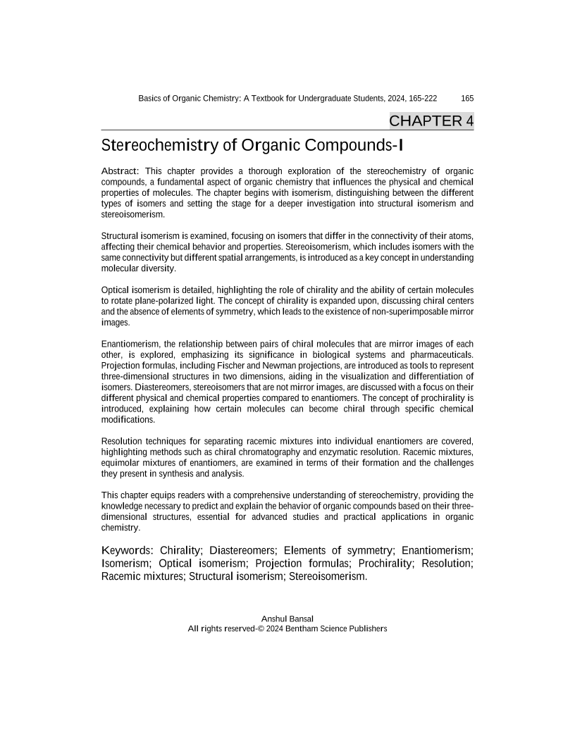 This chapter provides a thorough exploration of the stereochemistry of organic compounds, a fundamental aspect of organic chemistry that influences the physical and chemical properties of molecules. The chapter begins with isomerism, distinguishing between the different types of isomers and setting the stage for a deeper investigation into structural isomerism and stereoisomerism.Structural isomerism is examined, focusing on isomers that differ in the connectivity of their atoms, affecting their chemical behavior and properties. Stereoisomerism, which includes isomers with the same connectivity but different spatial arrangements, is introduced as a key concept in understanding molecular diversity. Optical isomerism is detailed, highlighting the role of chirality and the ability of certain molecules to rotate plane-polarized light. The concept of chirality is expanded upon, discussing chiral centers and the absence of elements of symmetry, which leads to the existence of non-superimposable mirror images. Enantiomerism, the relationship between pairs of chiral molecules that are mirror images of each other, is explored, emphasizing its significance in biological systems and pharmaceuticals. Projection formulas, including Fischer and Newman projections, are introduced as tools to represent three-dimensional structures in two dimensions, aiding in the visualization and differentiation of isomers. Diastereomers, stereoisomers that are not mirror images, are discussed with a focus on their different physical and chemical properties compared to enantiomers. The concept of prochirality is introduced, explaining how certain molecules can become chiral through specific chemical modifications.Resolution techniques for separating racemic mixtures into individual enantiomers are covered, highlighting methods such as chiral chromatography and enzymatic resolution. Racemic mixtures, equimolar mixtures of enantiomers, are examined in terms of their formation and the challenges they present in synthesis and analysis. This chapter equips readers with a comprehensive understanding of stereochemistry, providing the knowledge necessary to predict and explain the behavior of organic compounds based on their threedimensional structures, essential for advanced studies and practical applications in organic chemistry.