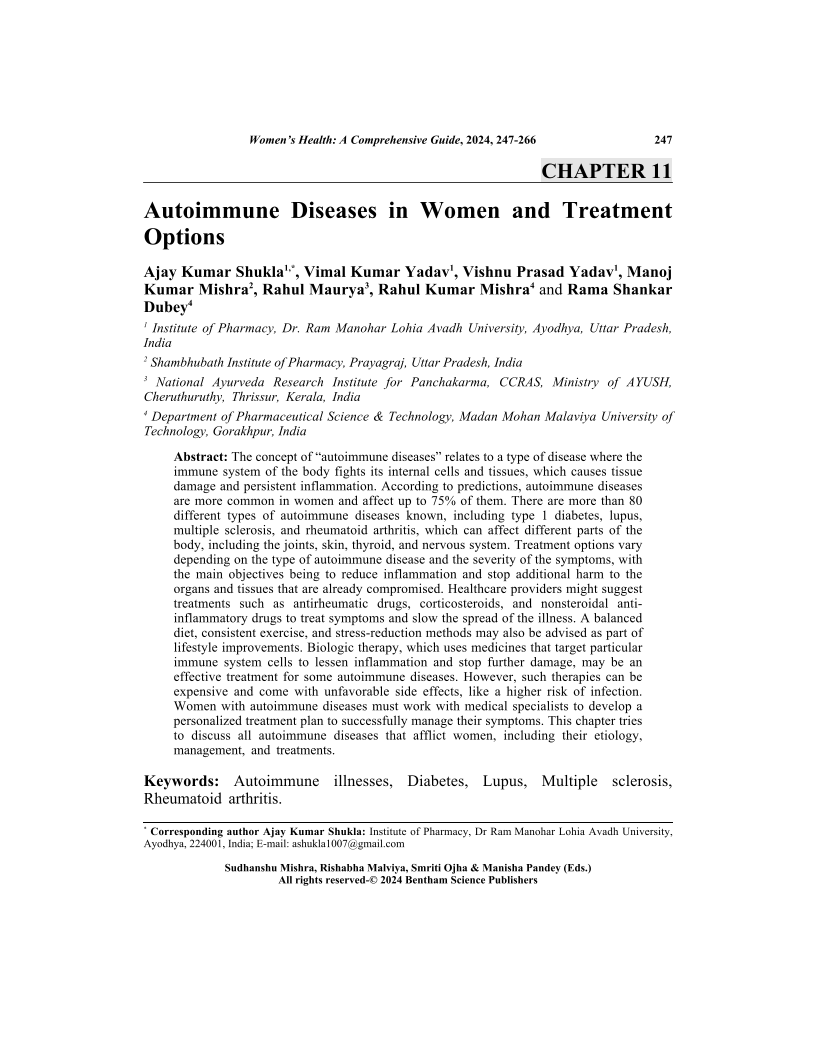 The concept of "autoimmune diseases" relates to a type of disease where the immune system of the body fights its internal cells and tissues, which causes tissue damage and persistent inflammation. According to predictions, autoimmune diseases are more common in women and affect up to 75% of them. There are more than 80 different types of autoimmune diseases known, including type 1 diabetes, lupus, multiple sclerosis, and rheumatoid arthritis, which can affect different parts of the body, including the joints, skin, thyroid, and nervous system. Treatment options vary depending on the type of autoimmune disease and the severity of the symptoms, with the main objectives being to reduce inflammation and stop additional harm to the organs and tissues that are already compromised. Healthcare providers might suggest treatments such as antirheumatic drugs, corticosteroids, and nonsteroidal antiinflammatory drugs to treat symptoms and slow the spread of the illness. A balanced diet, consistent exercise, and stress-reduction methods may also be advised as part of lifestyle improvements. Biologic therapy, which uses medicines that target particular immune system cells to lessen inflammation and stop further damage, may be an effective treatment for some autoimmune diseases. However, such therapies can be expensive and come with unfavorable side effects, like a higher risk of infection. Women with autoimmune diseases must work with medical specialists to develop a personalized treatment plan to successfully manage their symptoms. This chapter tries to discuss all autoimmune diseases that afflict women, including their etiology, management, and treatments.