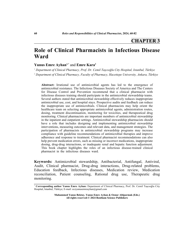 Irrational use of antimicrobial agents has led to the emergence of antimicrobial resistance. The Infectious Diseases Society of America and The Centers for Disease Control and Prevention recommend that a clinical pharmacist with infectious diseases training should participate in the antimicrobial stewardship teams. Several authors stated that antimicrobial stewardship effectively reduces inappropriate antimicrobial use, cost, and hospital stays. Prospective audits and feedback can reduce the inappropriate use of antimicrobials. Clinical pharmacists may help orient the healthcare team on selecting appropriate antimicrobial agents, administration routes, dosing, treatment discontinuation, monitoring for toxicities, and therapeutical drug monitoring. Clinical pharmacists are important members of antimicrobial stewardship in the inpatient and outpatient settings. Antimicrobial stewardship pharmacists should have a role that includes designing and implementing antimicrobial stewardship interventions, measuring outcomes and relevant data, and management strategies. The participation of pharmacists in antimicrobial stewardship programs may increase compliance with guideline recommendations of antimicrobial therapies and improve adherence and response to treatment. Clinical pharmacist recommendations can also help prevent medication errors, such as missing or incorrect medications, inappropriate dosing, drug-drug interactions, or inadequate renal and hepatic function adjustment. This book chapter highlights the roles of an infectious disease-trained clinical pharmacist in the infectious diseases ward.