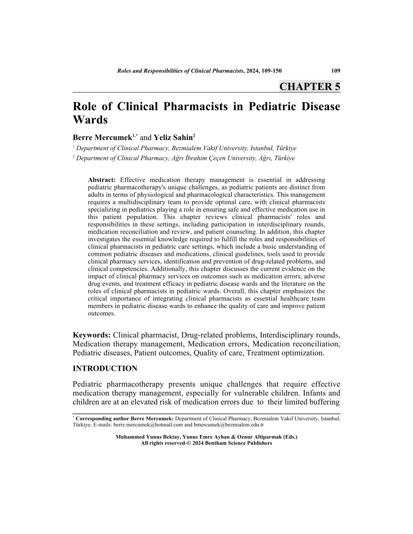 Effective medication therapy management is essential in addressing pediatric pharmacotherapy's unique challenges, as pediatric patients are distinct from adults in terms of physiological and pharmacological characteristics. This management requires a multidisciplinary team to provide optimal care, with clinical pharmacists specializing in pediatrics playing a role in ensuring safe and effective medication use in this patient population. This chapter reviews clinical pharmacists' roles and responsibilities in these settings, including participation in interdisciplinary rounds, medication reconciliation and review, and patient counseling. In addition, this chapter investigates the essential knowledge required to fulfill the roles and responsibilities of clinical pharmacists in pediatric care settings, which include a basic understanding of common pediatric diseases and medications, clinical guidelines, tools used to provide clinical pharmacy services, identification and prevention of drug-related problems, and clinical competencies. Additionally, this chapter discusses the current evidence on the impact of clinical pharmacy services on outcomes such as medication errors, adverse drug events, and treatment efficacy in pediatric disease wards and the literature on the roles of clinical pharmacists in pediatric wards. Overall, this chapter emphasizes the critical importance of integrating clinical pharmacists as essential healthcare team members in pediatric disease wards to enhance the quality of care and improve patient outcomes.