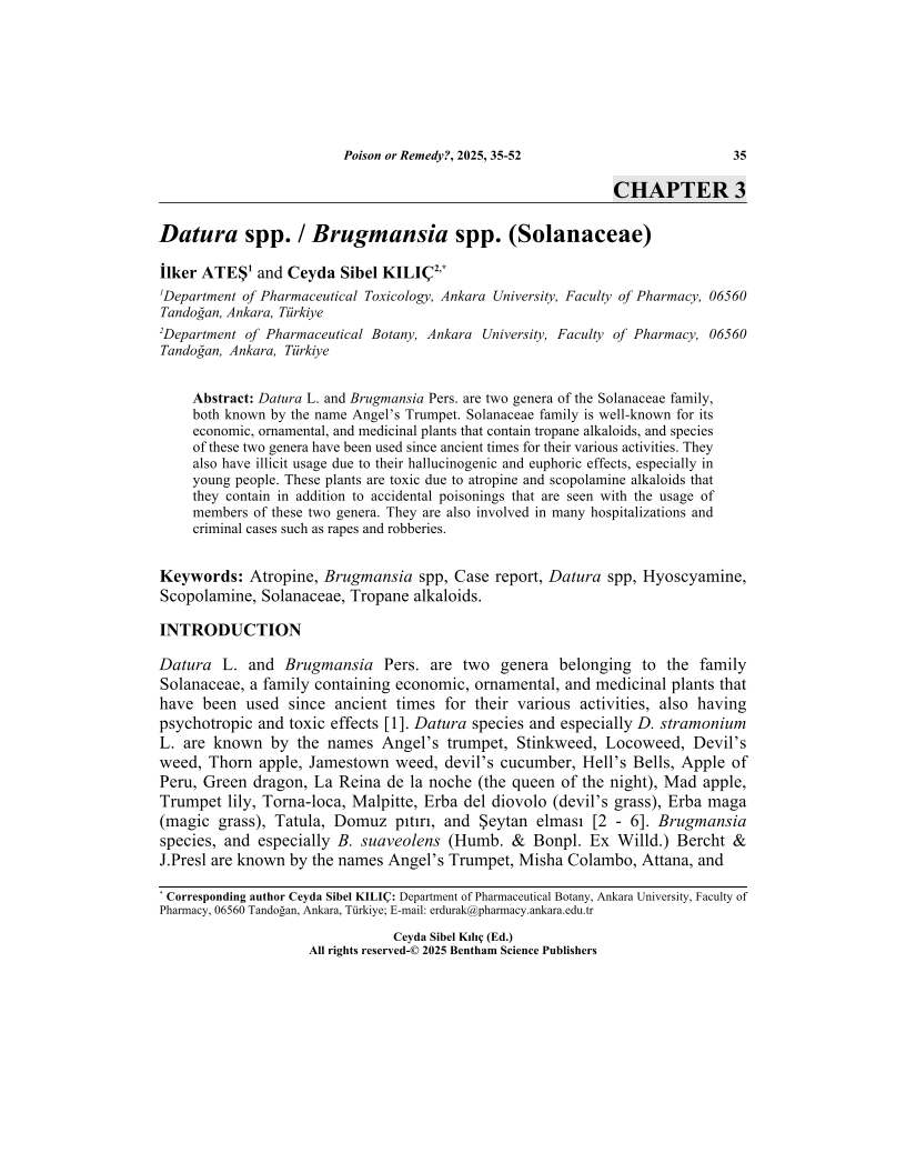 Datura L. and Brugmansia Pers. are two genera of the Solanaceae family, both known by the name Angel's Trumpet. Solanaceae family is well-known for its economic, ornamental, and medicinal plants that contain tropane alkaloids, and species of these two genera have been used since ancient times for their various activities. They also have illicit usage due to their hallucinogenic and euphoric effects, especially in young people. These plants are toxic due to atropine and scopolamine alkaloids that they contain in addition to accidental poisonings that are seen with the usage of members of these two genera. They are also involved in many hospitalizations and criminal cases such as rapes and robberies.