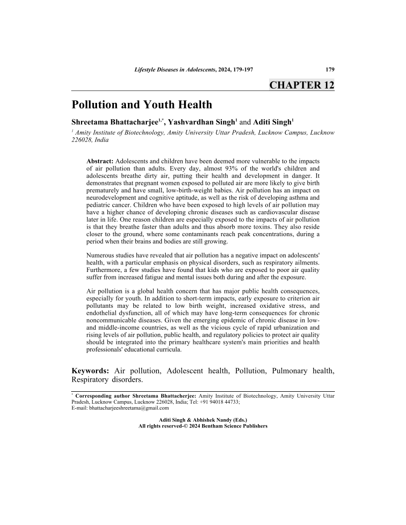 Adolescents and children have been deemed more vulnerable to the impacts of air pollution than adults. Every day, almost 93% of the world's children and adolescents breathe dirty air, putting their health and development in danger. It demonstrates that pregnant women exposed to polluted air are more likely to give birth prematurely and have small, low-birth-weight babies. Air pollution has an impact on neurodevelopment and cognitive aptitude, as well as the risk of developing asthma and pediatric cancer. Children who have been exposed to high levels of air pollution may have a higher chance of developing chronic diseases such as cardiovascular disease later in life. One reason children are especially exposed to the impacts of air pollution is that they breathe faster than adults and thus absorb more toxins. They also reside closer to the ground, where some contaminants reach peak concentrations, during a period when their brains and bodies are still growing. Numerous studies have revealed that air pollution has a negative impact on adolescents' health, with a particular emphasis on physical disorders, such as respiratory ailments. Furthermore, a few studies have found that kids who are exposed to poor air quality suffer from increased fatigue and mental issues both during and after the exposure.Air pollution is a global health concern that has major public health consequences, especially for youth. In addition to short-term impacts, early exposure to criterion air pollutants may be related to low birth weight, increased oxidative stress, and endothelial dysfunction, all of which may have long-term consequences for chronic noncommunicable diseases. Given the emerging epidemic of chronic disease in lowand middle-income countries, as well as the vicious cycle of rapid urbanization and rising levels of air pollution, public health, and regulatory policies to protect air quality should be integrated into the primary healthcare system's main priorities and health professionals' educational curricula.