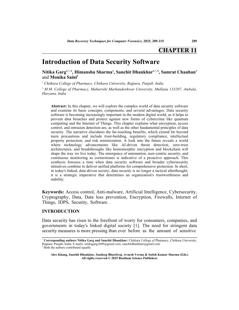 In this chapter, we will explore the complex world of data security software and examine its basic concepts, components, and several advantages. Data security software is becoming increasingly important in the modern digital world, as it helps to prevent data breaches and protect against new forms of cybercrime like quantum computing and the Internet of Things. This chapter explains what encryption, access control, and intrusion detection are, as well as the other fundamental principles of data security. The narrative elucidates the far-reaching benefits, which extend far beyond mere precautions and include trust-building, regulatory compliance, intellectual property protection, and risk minimization. A look into the future reveals a world where technology advancements like AI-driven threat detection, zero-trust architectures, and breakthroughs like homomorphic encryption and blockchain will shape the way we live today. The emergence of automation, user-centric security, and continuous monitoring as cornerstones is indicative of a proactive approach. This synthesis foresees a time when data security software and broader cybersecurity initiatives combine to deliver unified platforms for comprehensive protection. In short, in today's linked, data-driven society, data security is no longer a tactical afterthought; it is a strategic imperative that determines an organization's trustworthiness and stability.