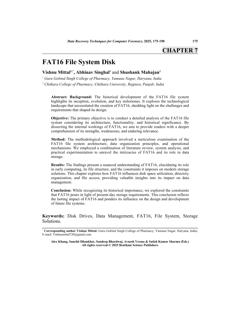 Background: The historical development of the FAT16 file system highlights its inception, evolution, and key milestones. It explores the technological landscape that necessitated the creation of FAT16, shedding light on the challenges and requirements that shaped its design.Objective: The primary objective is to conduct a detailed analysis of the FAT16 file system considering its architecture, functionality, and historical significance. By dissecting the internal workings of FAT16, we aim to provide readers with a deeper comprehension of its strengths, weaknesses, and enduring relevance. Method: The methodological approach involved a meticulous examination of the FAT16 file system architecture, data organization principles, and operational mechanisms. We employed a combination of literature review, system analysis, and practical experimentation to unravel the intricacies of FAT16 and its role in data storage. Results: The findings present a nuanced understanding of FAT16, elucidating its role in early computing, its file structure, and the constraints it imposes on modern storage solutions. This chapter explores how FAT16 influences disk space utilization, directory organization, and file access, providing valuable insights into its impact on data management. Conclusion: While recognizing its historical importance, we explored the constraints that FAT16 poses in light of present-day storage requirements. This conclusion reflects the lasting impact of FAT16 and ponders its influence on the design and development of future file systems.