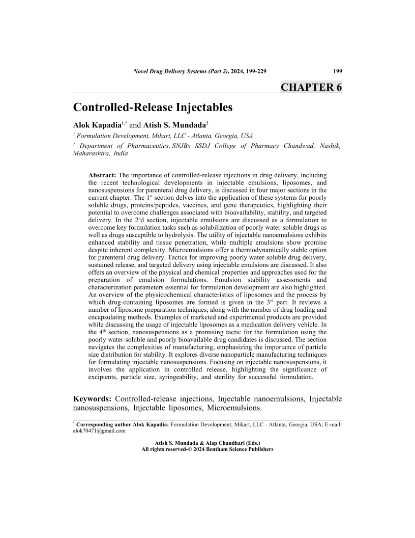 The importance of controlled-release injections in drug delivery, including the recent technological developments in injectable emulsions, liposomes, and nanosuspensions for parenteral drug delivery, is discussed in four major sections in the current chapter. The 1st section delves into the application of these systems for poorly soluble drugs, proteins/peptides, vaccines, and gene therapeutics, highlighting their potential to overcome challenges associated with bioavailability, stability, and targeted delivery. In the 2n d section, injectable emulsions are discussed as a formulation to overcome key formulation tasks such as solubilization of poorly water-soluble drugs as well as drugs susceptible to hydrolysis. The utility of injectable nanoemulsions exhibits enhanced stability and tissue penetration, while multiple emulsions show promise despite inherent complexity. Microemulsions offer a thermodynamically stable option for parenteral drug delivery. Tactics for improving poorly water-soluble drug delivery, sustained release, and targeted delivery using injectable emulsions are discussed. It also offers an overview of the physical and chemical properties and approaches used for the preparation of emulsion formulations. Emulsion stability assessments and characterization parameters essential for formulation development are also highlighted. An overview of the physicochemical characteristics of liposomes and the process by which drug-containing liposomes are formed is given in the 3rd part. It reviews a number of liposome preparation techniques, along with the number of drug loading and encapsulating methods. Examples of marketed and experimental products are provided while discussing the usage of injectable liposomes as a medication delivery vehicle. In the 4th section, nanosuspensions as a promising tactic for the formulation using the poorly water-soluble and poorly bioavailable drug candidates is discussed. The section navigates the complexities of manufacturing, emphasizing the importance of particle size distribution for stability. It explores diverse nanoparticle manufacturing techniques for formulating injectable nanosuspensions. Focusing on injectable nanosuspensions, it involves the application in controlled release, highlighting the significance of excipients, particle size, syringeability, and sterility for successful formulation.