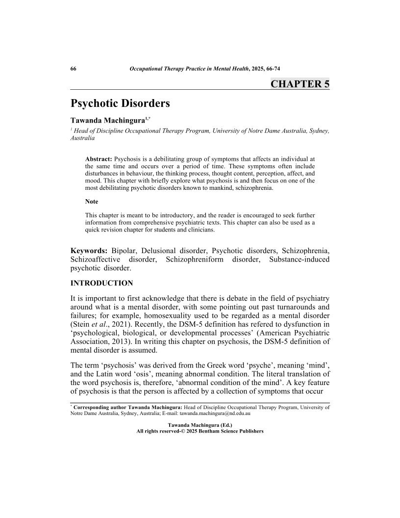 Psychosis is a debilitating group of symptoms that affects an individual at the same time and occurs over a period of time. These symptoms often include disturbances in behaviour, the thinking process, thought content, perception, affect, and mood. This chapter with briefly explore what psychosis is and then focus on one of the most debilitating psychotic disorders known to mankind, schizophrenia. Note This chapter is meant to be introductory, and the reader is encouraged to seek further information from comprehensive psychiatric texts. This chapter can also be used as a quick revision chapter for students and clinicians.