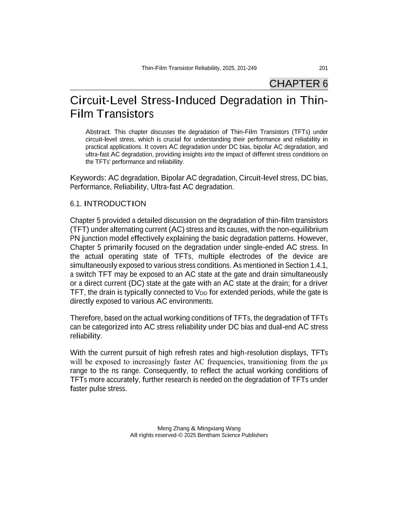 This chapter discusses the degradation of Thin-Film Transistors (TFTs) under circuit-level stress, which is crucial for understanding their performance and reliability in practical applications. It covers AC degradation under DC bias, bipolar AC degradation, and ultra-fast AC degradation, providing insights into the impact of different stress conditions on the TFTs' performance and reliability.