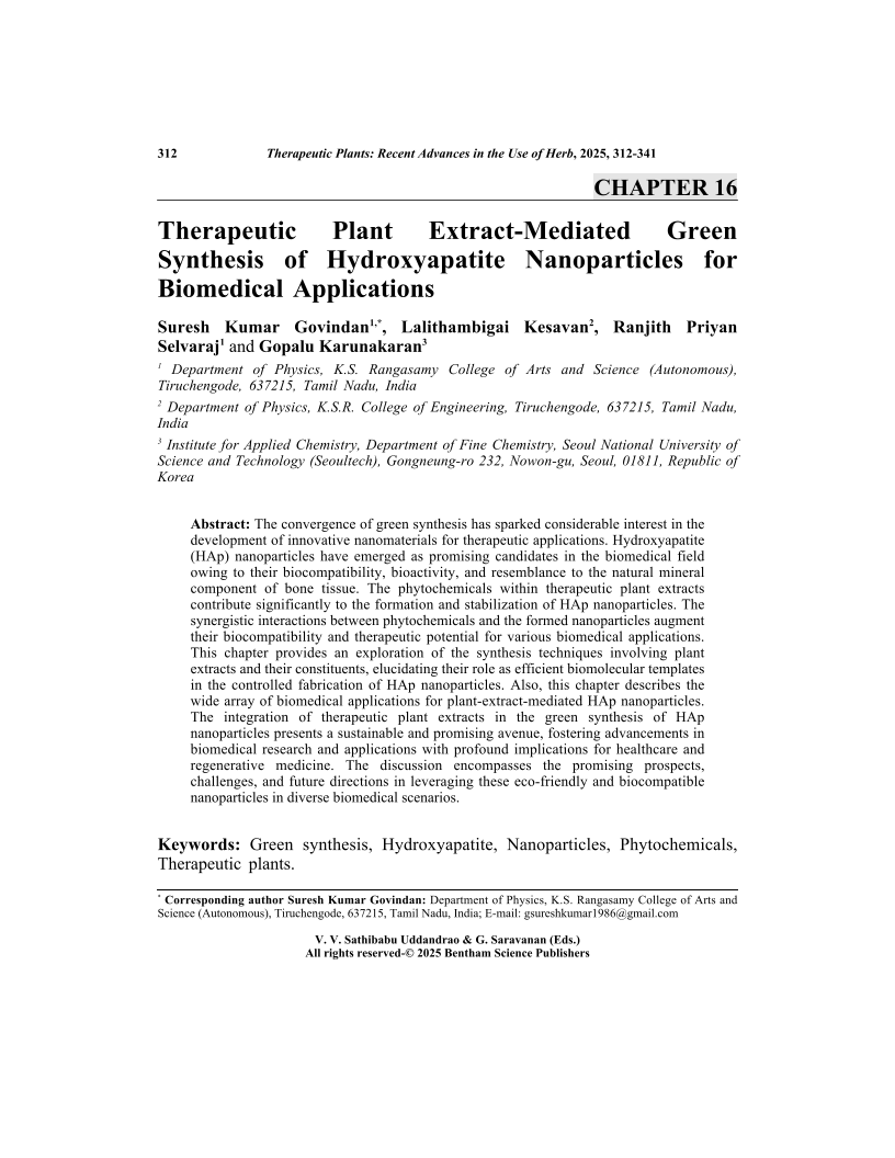 Therapeutic Plant Extract-Mediated Green Synthesis of Hydroxyapatite Nanoparticles for Biomedical Applications, Page 1 of 1