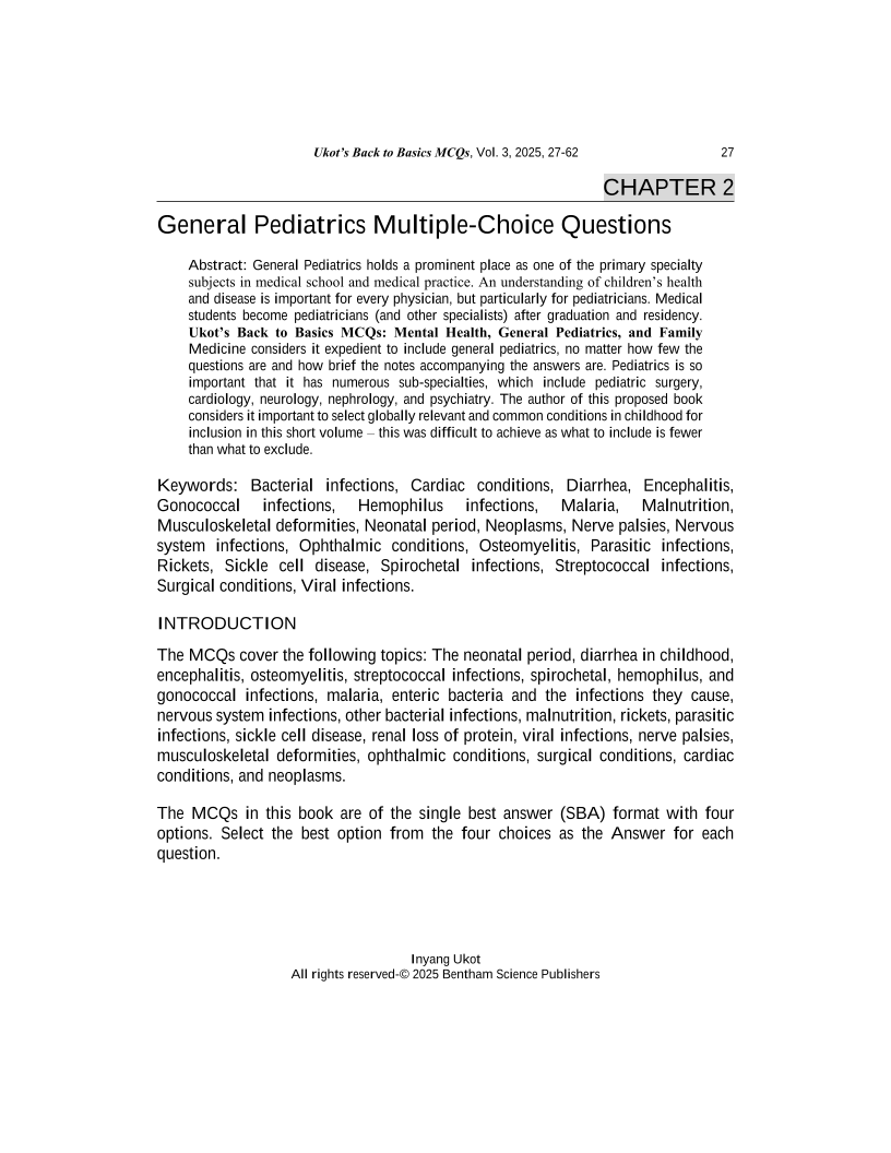 General Pediatrics holds a prominent place as one of the primary specialty subjects in medical school and medical practice. An understanding of children's health and disease is important for every physician, but particularly for pediatricians. Medical students become pediatricians (and other specialists) after graduation and residency. Ukot's Back to Basics MCQs: Mental Health, General Pediatrics, and Family Medicine considers it expedient to include general pediatrics, no matter how few the questions are and how brief the notes accompanying the answers are. Pediatrics is so important that it has numerous sub-specialties, which include pediatric surgery, cardiology, neurology, nephrology, and psychiatry. The author of this proposed book considers it important to select globally relevant and common conditions in childhood for inclusion in this short volume this was difficult to achieve as what to include is fewer than what to exclude.