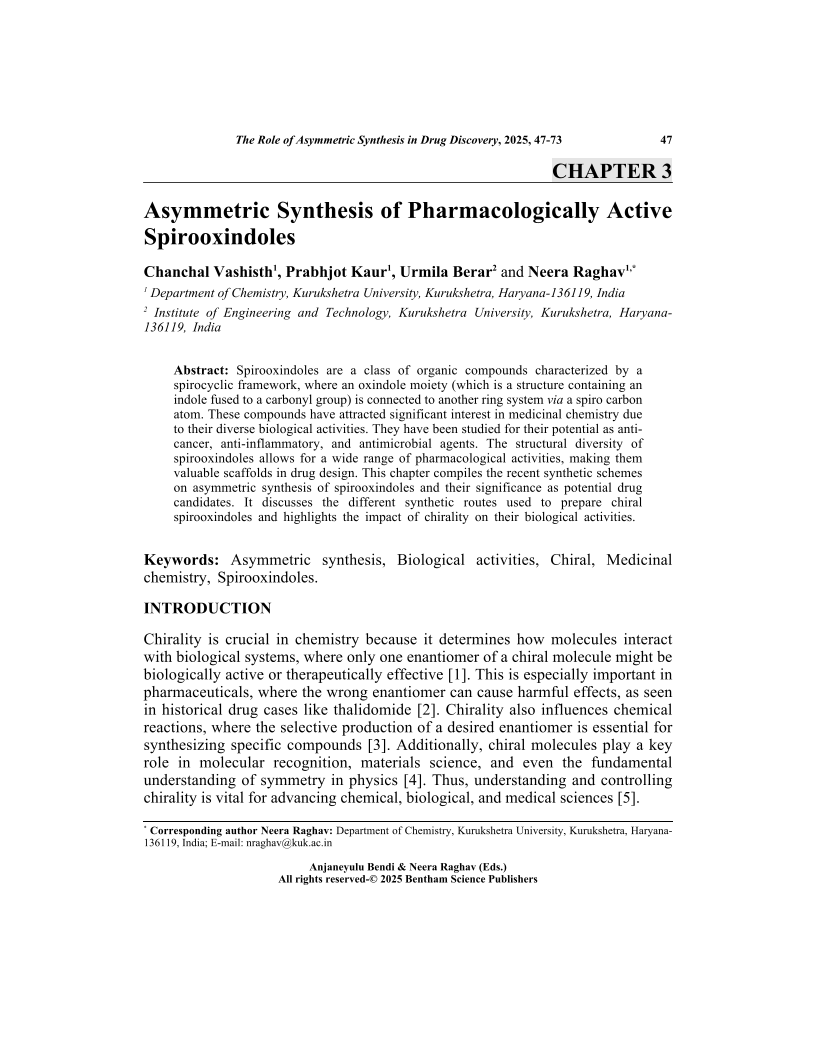 Spirooxindoles are a class of organic compounds characterized by a spirocyclic framework, where an oxindole moiety (which is a structure containing an indole fused to a carbonyl group) is connected to another ring system via a spiro carbon atom. These compounds have attracted significant interest in medicinal chemistry due to their diverse biological activities. They have been studied for their potential as anticancer, anti-inflammatory, and antimicrobial agents. The structural diversity of spirooxindoles allows for a wide range of pharmacological activities, making them valuable scaffolds in drug design. This chapter compiles the recent synthetic schemes on asymmetric synthesis of spirooxindoles and their significance as potential drug candidates. It discusses the different synthetic routes used to prepare chiral spirooxindoles and highlights the impact of chirality on their biological activities.