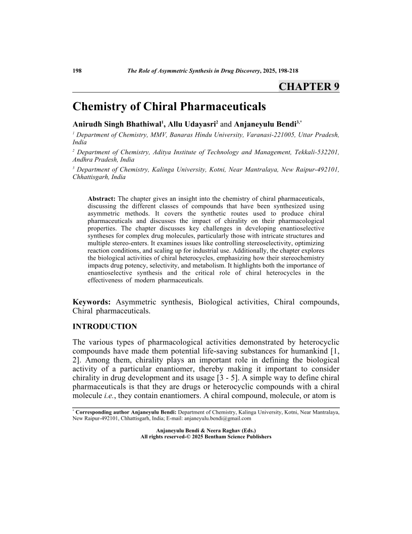 The chapter gives an insight into the chemistry of chiral pharmaceuticals, discussing the different classes of compounds that have been synthesized using asymmetric methods. It covers the synthetic routes used to produce chiral pharmaceuticals and discusses the impact of chirality on their pharmacological properties. The chapter discusses key challenges in developing enantioselective syntheses for complex drug molecules, particularly those with intricate structures and multiple stereo-enters. It examines issues like controlling stereoselectivity, optimizing reaction conditions, and scaling up for industrial use. Additionally, the chapter explores the biological activities of chiral heterocycles, emphasizing how their stereochemistry impacts drug potency, selectivity, and metabolism. It highlights both the importance of enantioselective synthesis and the critical role of chiral heterocycles in the effectiveness of modern pharmaceuticals.
