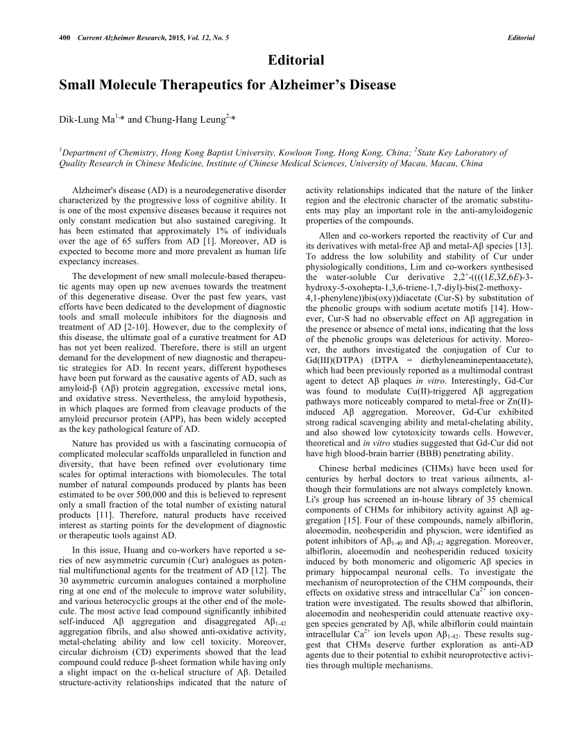 Editorial (Thematic Issue: Small Molecule Therapeutics for Alzheimer’s Disease), Page 1 of 1