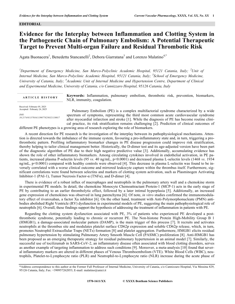 4. DarwishI. FareedJ. BrailovskyY. Dysregulation of biomarkers of hemostatic activation and inflammatory processes are associated with adverse outcomes in pulmonary embolism.Clin. Appl. Thromb. Hemost.2022281076029621106489810.1177/10760296211064898 35043658